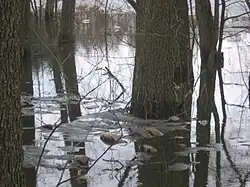 The park's terrain was primarily shaped during the Pleistocene through the aggradation of rock material carried by the ice sheet during the last glaciation in present-day Poland, the Weichselian glaciation. As the ice sheet retreated, small depressions formed, now appearing as kettle lakes.[5] The water body in the park, due to rooted vegetation across its surface and artificial fish stocking, is commonly called a pond.[5]