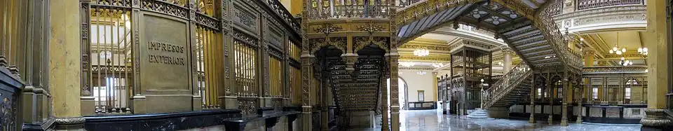 Inside, the marble floors and shelves combine with bronze and iron window frames manufactured in Florence, Italy.[3] The main stairway is characterized by two separate ramps that come together to form a landing. They also seem to cross on the second landing above, after which each move off in their own direction.[5] The meeting room contains frescos by Bartolomé Gallotti painted over a base of 24 carat gold, with themes relating to the history of written communication and the sending of messages.[3]