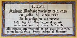The courtyard garden, divided into four parts in keeping with its traditional Islamic style, includes tiled paths and a centralized raised fountain.[8] The palace garden's lemon trees and fountain are recurring symbols in Machado's poetry.[9] Behind the garden is a courtyard surrounded by arches with columns of white marble. The arch situated west of the courtyard in the lower galleries gives access to the building that was used as chapel. The 15th-century chapel has fared badly during restorations.[1] The altar contains several tiles with metallic reflections, typical of 16th-century Seville ceramics.