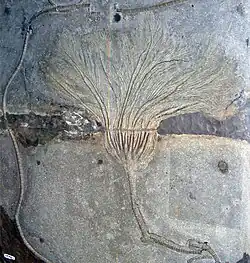 - One of the most complex organism interactions on the Posidonia Shale were the crinoid megarafts that grouped a wide variety of animals, creating large floating ecosystems.[13] The largest megaraft found measured 18 metres (59 ft), and is based on an Agathoxylon trunk, where different animals were attached.[13] The first attached animals would have been the growing community of oysters, bivalves and crinoids, that would add a small weight to the raft (about 800 kilograms (1,800 lb)).[13] The presence of these megarafts were in part possible due to the absence of marine wood worms which destroy tree logs in less than 3 years along with the absence of modern raft wood predators (that appeared on the Bathonian). These rafts could last up to 5 years, which is the main reason the crinoids attached were able to reach huge sizes.[13] These rafts were likely also essential to distribute animals along sea basins.[13] Seirocrinus & Pentacrinites were some of the main crinoid colonizers of the floating rafts.[14] Seirocrinus is the main representative of the pelagic crinoids, being among the longest animals known, reaching 26 m long in the largest documented specimen.[14] The ecology of the genus is widely known, with it being known that the smallest stems were among the first animals to colonize the rafts, with at least 2 generations of crinoids found per raft, where the hydrodynamic changes of the log influenced the settlement of the crinoids.[14] It is believed that Seirocrinus underwent seasonal reproduction linked to monsoonal conditions that sent new logs to the sea.[14] The large crinoids would have feed on pelagic micronutrients, and after the log fell to the bottom, all of the colony would have died.[14]