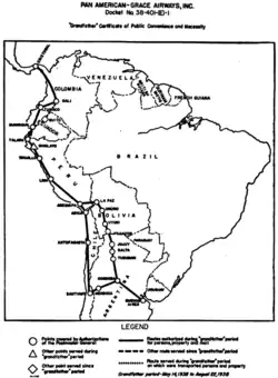 Upon enactment of the Act, it was immediately recommended that Pan American and Pan American Grace Airways be issued this certificate. Both carriers now operated a "circle" of service all the way around South America and their viability was more crucial than ever before. Pan American noted that the two carrier's services were meant to be complementary rather than competitive and in nearly every instance they were. Specifically, a large percentage of Pan American's traffic carried from the Canal Zone to the United States Mainland was as a result of flow-thru traffic from Pan American Grace destinations along the West Coast of South America to the Canal Zone and the same for Pan American Grace from Pan American's southbound operations to the Canal Zone.[4] Pan American-Grace received its certificate on 22 July 1940, backdated to 22 August 1938.[6]