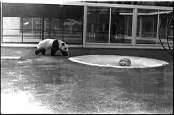 Upon the pandas' arrival in April 1972, First Lady Pat Nixon donated them to the National Zoo in Washington, D.C., where she welcomed them in an official ceremony. Over 20,000 people visited the pandas the first day they were on display, and an estimated 1.1 million visitors came to see them the first year they were in the United States.[13] The pandas were wildly popular and China's gift was seen as an enormous diplomatic success, evidence of China's eagerness to establish official relations with the U.S.[14] It was so successful that British Prime Minister Edward Heath asked for pandas for the United Kingdom during a visit to China in 1974. Pandas Chia-Chia and Ching-Ching arrived at the London Zoo a few weeks later.[13] The pandas gifted to the UK would later be the inspiration for the logo of the World Wildlife Fund.[11]