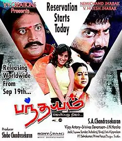 Pandhayam (transl. Bet) is a 2008 Indian Tamil-language action thriller film directed by S. A. Chandrasekhar, starring Nithin Sathya and Sindhu Tolani while Prakash Raj and Radhika play supporting roles. Vijay did a guest role as himself. The music was composed by Vijay Antony with cinematography by Srinivas Devamsam and editing by J. N. Harsha. The film was released on 19 September 2008.[1]
