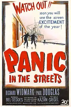 Panic in the Streets is a 1950 American medical-themed film noir thriller, directed by Elia Kazan and released by 20th Century Fox. It was shot exclusively on location in New Orleans, Louisiana, and features numerous scenes around the city and Port of New Orleans along the Mississippi River and showing various New Orleans citizens in speaking and non-speaking roles.[2]