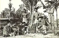 The battalion would ultimately serve in many of the Allied campaigns in New Guinea; however, due to the nature of its role its sub-units would mainly operate separately, attached to larger Australian and US units and formations. As such, unlike the headquarters of standard Australian battalions, the PIB's headquarters was primarily employed as an administration and training company, and saw little action.[20] One of the commanding officer's primary roles was to ensure members of the battalion were appropriately utilised and recognised for their service, and in this role regularly liaised with the Australian New Guinea Administrative Unit (ANGAU) and New Guinea Force.[21] Headquarters Company also included the battalion Q Store. In addition to holding the usual equipment required of any Australian unit, due to the unique makeup of the PIB it had the added challenge of obtaining specific food and clothing required by native soldiers. The Signals Section was responsible for maintaining communications within the battalion and with other units in the Port Moresby area by field telephone, with Papuans and New Guineans attached to the section being taught all aspects of the maintenance and operation of the switchboard and line equipment. Although the War Establishment provided for a Regimental Medical Officer and medical orderlies (all Europeans), no permanent medical staff were posted to the unit until June 1943. Prior to this, orderlies were supplied by ANGAU on attachment, although there were occasions during subsequent operations when the men were without medical support, or were supported by medics from the US Army.[22]