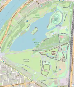 ![]() View of the Lac de la Tête-d'Or (Lake of the Head of Gold) from near the Porte des Enfants du Rhône (Gate of the Children of Rhône), the main entrance | |