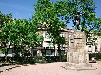 In the central area of the park, there is a monument to military commander Vojin Popović (1881-1916), who was nicknamed Vojvoda Vuk. It was sculptured by Đorđe Jovanović in 1922, but was placed in the park on 10 October 1936.[1][2][9] The monument has a skull with crossed bones on two sides. They are markings of the Chetniks guerilla from the 1903-1918 period, but were adopted by the Chetniks in World War II. Still, after the Communists, rivals of the Chetniks, took over in 1945, they didn't tear down the monument.[8]