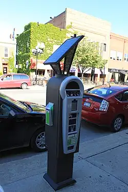 A solar-powered multi-space meter in Ann Arbor, Michigan. Similar meters are also used in White Rock, British Columbia,[12] and Houston, Texas.[13] Solar is optional.