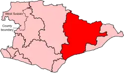 | Lewes CC | 76,166 | 12,624 | James MacCleary ¤ | Maria Caulfield † | Lewes District Council: Ditchling and Westmeston, Kingston, Lewes Bridge, Lewes Castle, Lewes Priory, Newhaven North, Newhaven South, Ouse Valley and Ringmer, Plumpton, Streat, East Chiltington and St. John, Seaford Central, Seaford East, Seaford North, Seaford South, Seaford West. Wealden District Council: Arlington, Lower Willingdon, Polegate Central, Polegate North, Polegate South and Willingdon Watermill, South Downs, Stone Cross, Upper Willingdon. | ![]() | ||