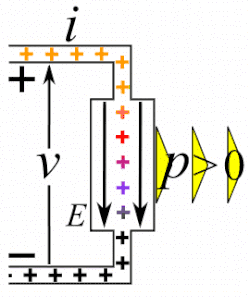 The passive sign convention states that in components in which the conventional current variable i is defined as entering the device through the terminal which is positive as defined by the voltage variable v,[2][4] the power p and resistance r are given by[5][6][7]