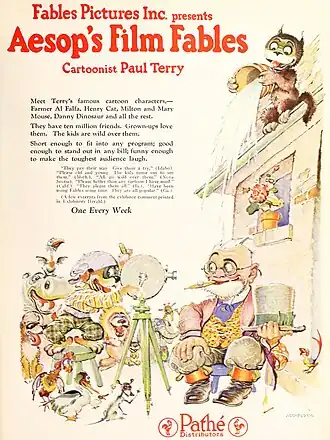 In 1920, Terry entered into a partnership with Amedee J. Van Beuren, and founded Fables Pictures. The studio signed a contract with Pathé Pictures on June 7, 1921. The first picture was released on June 19 on that same year.[14] During this time, Terry began producing a series of Aesop's Film Fables as well as new Farmer Al Falfa films under that banner. Terry experimented with the sound process in a Fable Cartoon called Dinner Time after pressure from Van Beuren, released in September 1928, two months before Walt Disney's Steamboat Willie was released in November 1928.[6]