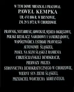 Paweł Kempka (born 4 June 1886 in Brynów, died 29 October 1972 in Chorzów) was a Polish lawyer, national activist, and local government official. He was a co-creator of the legal system of the Silesian Voivodeship, MP to the Silesian Parliament representing the Polish Christian Democratic Party, and the first president of the Alliance of Democrats in Chorzów.[1]
