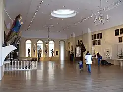 By the end of the 18th century, coinciding with the museum's 1799 founding, Salem was one of the nation's most prosperous seaports, and extensive trading of furs, spices, dyes, and other goods brought much wealth to the region.[35] This long legacy of trade contributed greatly to the foundation and growth of PEM's maritime art collection, which is among the finest of its kind in the country.[36] The collection includes over 50,000 objects, including paintings, model ships, scrimshaw, and more. Many diverse styles and periods of maritime art are on display in the collection, from navigational tools such as sextants to modern marine art, which addresses "nostalgic themes" and represents "the seafaring life of previous times".[37] One significant feature of the currently installed collection is a recreation of a room in Cleopatra's Barge, an opulent yacht which was built by Salem's Crowninshield family and eventually became the royal yacht of King Kamehameha II.