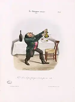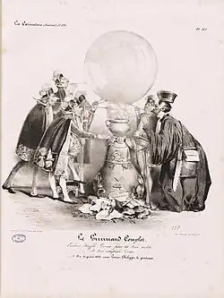 Charles Philipon was born in Lyon in 1800, the son of a wallpaper merchant. At the age of 23, he moved to Paris to pursue an artistic career.[47] To support himself, he initially worked for image makers on Rue Saint-Jacques and for manufacturers of labels and rebuses, illustrating numerous affordable story sheets.[48] From 1824 onward, he began studying lithography[49] while specializing in producing individual works, which were sold as separate sheets.[50] His early works were focused on popular subjects, including fashion series, caricatures of manners, and comic advertisements, although they did not stand out as exceptional.[51]