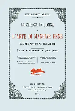 His manual, however, entitled La scienza in cucina e l'arte di mangiar bene (Science in the Kitchen and the Art of Eating Well), published in Florence in 1891, was much more successful. He could not find a publisher so he used his own money to self-publish, selling a thousand copies of the first edition in four years.[4] Soon, however, the cookbook became popular, and before Artusi died, more than 200,000 copies had been sold. Regarded as the bible of Italian cookbooks, it is filled with amusing anecdotes as well as 790 recipes. The book is a perennial best seller in Italy, and has been translated into Spanish, French, Dutch, German, English and, most recently, Portuguese and Polish.