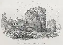 The Welsh name Pen-coed means "end of the wood", and refers to the site's location at the southwestern extremity of the Wentwood forest.[3] It was the site of a Norman castle, owned by Sir Richard de la More in 1270. The tower at the south-west corner of the extant ruins dates from the late 13th century.[3][4][5] The manor of Llanmartin was owned by the Kemeys family around 1300, but it is not clear whether Pencoed was a separate manor at that time.[3]