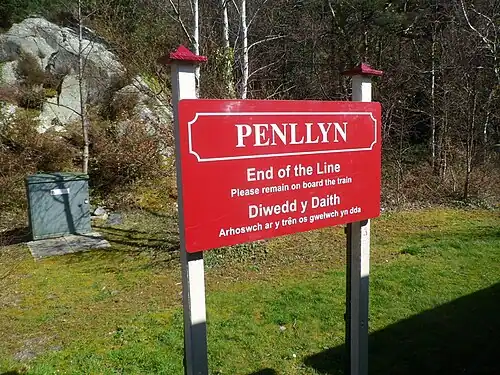 Penllyn (LLR) railway station is the northern terminus of the Llanberis Lake Railway (LLR),[2] located near Llanberis, Gwynedd, Wales. The station has no platform, but passengers are allowed to alight.[3]