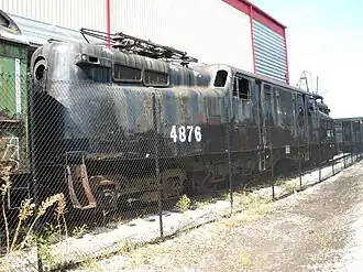 The reconstructed #4876 was returned to DGLE, single stripe by 1956. It remained in service for approximately 30 more years with the PRR, Penn Central, Conrail and finally New Jersey Transit. In 1983, the locomotive was retired and donated for preservation. Originally slated for donation to the Smithsonian Institution, it was ultimately donated to the B&O Railroad Museum in Baltimore, Maryland.[12][13] Originally, the museum planned on cosmetically restoring #4876 and putting it on static display. These plans were placed on hold indefinitely when the museum's roundhouse roof collapsed in 2003, and the museum focused its efforts on restoring the equipment damaged by the collapse.[14][15] The locomotive has been stored outside since it was acquired by the museum. It has become defaced with graffiti and parts of its steel body have corroded.[15]