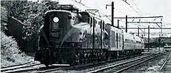 The Pennsylvania Railroad class GG1 was built to haul longer passenger trains at high speeds, particularly on the Northeast Corridor and the Main Line, during the PRR's massive electrification projects of the 1930s. Constructed in 1943 at Juniata Shops, No. 4935 was among the last of the GG1 series to be built.[1] Like most GG1 locomotives, it was transferred to Penn Central Transportation Company when the PRR merged into Penn Central in 1968, then to Amtrak when it briefly took over intercity passenger service in 1971.[2]