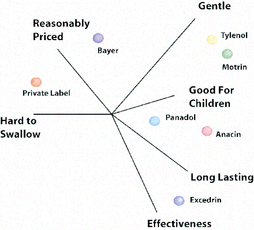 Some maps plot ideal vectors instead of ideal points. The map below displays various aspirin products as seen on the dimensions of effectiveness and gentleness. It also shows two ideal vectors. The slope of the ideal vector indicates the ratio of the two dimensions preferred by those consumers within that segment. This study indicates that there is one segment that is more concerned with effectiveness than harshness, and another segment that is more interested in gentleness than strength.