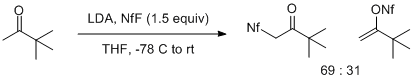 The reaction of enolates with NfF depends strongly both on the structure of the enolate and its metal counterion. The lithium enolates of methyl ketones give mixtures of products derived from electrophilic attack on the O (expected) or C (unexpected) atoms of the enolate. This effect is particularly evident with the lithium enolate of pinacolone, which gives a 2:1 mixture favoring C-attack. More substituted lithium enolates give only products of O sulfonylation in variable yields.[6]