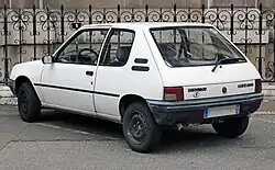 It was launched on 24 February 1983, and was launched in right-hand drive form for the UK market in September that year.[6] Shortly after its launch, it was narrowly pipped to the European Car of the Year award by the similar sized Fiat Uno, but ultimately (according to the award organizers) it would enjoy a better image and a longer high market demand than its Italian competitor.[7] It was one of five important small cars to be launched onto the European market within a year of each other: the other four were the Uno, the second generation Ford Fiesta, the original Opel Corsa (sold as the Vauxhall Nova on the British market) and the original Nissan Micra. Its launch also closely followed that of the Austin Metro and Volkswagen Polo Mk2.