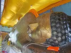 Preah Ang Thom (Khmer: ព្រះអង្គធំ) is an 8 metres (26 ft) tall statue of the reclining Buddha reaching nirvana. The statue is carved into a huge sandstone boulder. Preah Ang Thom is the sacred and worshipping god for Phnom Kulen. There are also two big trees of Cham Pa (Khmer: ដើមចំប៉ា) at nearby. Besides Preah Ang Thom, there are Chhok Ruot (Khmer: ឆ័តរួត), footprint of Preah Bat Choan Tuk (Khmer: បាតជើងព្រះបាទជាន់ទុក្ខ), Peung Chhok (Khmer: ពើងឆ័ត), Peung Ey So (Khmer: ពើងឥសូ) and Peung Ey Sey (Khmer: ពើងឥសី).
