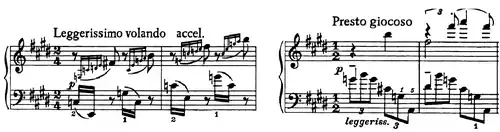 | 3 | 227–270 | The next section features materials derived from the coda and the introduction. First, the presto tumultuoso esaltato is developed. The trills theme is briefly quoted(mm. 247–250). Then, the languido theme is mocked (mm. 251ff.). | ||