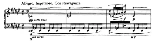 1–12 | The sonata begins with an introduction. Its first part consists of an agitated theme, marked allegro-impetuoso-con stravaganza. It features trills and glissandos, and ends in an agitated ascending rush followed by a pause. |