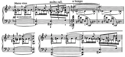 120–139 | The second theme begins at m. 120. It is marked meno mosso, is in B♭ major and also set in binary form. The first half begins with a chromatic phrase built over a dominant chord. The second (mm. 134 ff.) quotes the first but now over a tonic pedal. | |