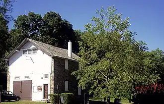 The springhouse, built in 1801, is located in the median of Tilden Street west of the barn.