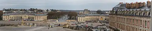 In 1660, when Louis XIV decided to extend his palace, there was only a small square in front of it, extending into an alley that joined the Chemin de Saint-Cloud. Initially, the plan was to lay out three crow's-foot alleys starting from a half-moon-shaped square. But this project was too modest for the sovereign. It was decided to level and enlarge the Place d'Armes, and to radiate from it three wide avenues planted with trees. To achieve this, thousands of cubic meters of earth were removed from the top of the Montbauron hillock to level it, and used to fill in the square.[1]