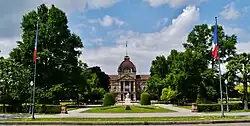 The Place de la République was designed by architect Jean-Geoffroy Conrath (1824–1892) during the Reichsland period as the conspicuous and grandiose entrance of the Neustadt opposite the ancient Grande Île city center on the other side of the Ill. The layout and construction of the square began in 1880.[1] It was then called Kaiserplatz ("Imperial Square" or "Emperor Square").[3] Ginkgo biloba trees, which were presented by Emperor Meiji of Japan to his German counterpart (either Wilhelm I or Wilhelm II, depending on the source), were planted in the central garden in the 1880s; those trees still stand today.[4][5] Conversely, a purple beech and a fern-leaf beech, planted between 1883 and 1887, were felled by a storm in the night of the 19–20 June 2019.[6]