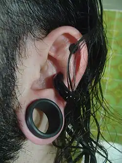 A plug (sometimes earplug or earspool), in the context of body modification, is a short, cylindrical piece of jewelry commonly worn in larger-gauge body piercings.[1] Modern western plugs are also called flesh tunnels. Because of their size—which is often substantially thicker than a standard metal earring—plugs can be made out of almost any material. Acrylic glass, metal, wood, bone, stone, horn, glass, silicone or porcelain are all potential plug materials.