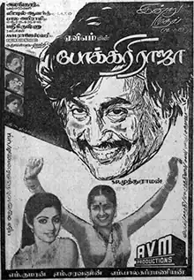 Pokkiri Raja (transl. Rogue King) is a 1982 Indian Tamil-language action comedy film directed by S. P. Muthuraman and written by Panchu Arunachalam. A remake of the Telugu film Chuttalunnaru Jagratha (1980), it stars Rajinikanth, Sridevi and Radhika. The film revolves around a man who was framed for murder, and a lookalike who aids him in finding the true killers. It was released on 14 January 1982 and became a commercial success, running for over 100 days in theatres.