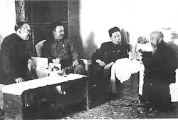 The Second ETR, initially led by Elihan Tore, was founded in November 1944 during the Ili Rebellion with Soviet support and was based in three northwest districts of Xinjiang.[8] Tore disappeared in the Soviet Union in 1946, and another ETR leader, Ehmetjan Qasimi, head of the pro-Soviet Sinkiang Turkic People's National Liberation Committee, reached a political agreement with the Nationalist Chinese leader Zhang Zhizhong to form a coalition provincial government in Dihua (present-day Urumqi).[9] The Second ETR was disbanded in name but the Three Districts retained autonomy.[8] Qasimi became the vice-chairman of the coalition government.[10] In June 1947, the Nationalist Chinese forces clashed with Mongolian and Soviet forces at Beitashan in northeastern Xinjiang. In that conflict, Kazakh leader Osman Batur of the ETR repudiated the ETR and defected to join Nationalist Chinese forces in fighting against Soviet-backed Mongolian forces.[11]