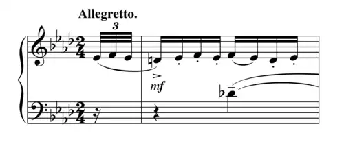 Polka de W.R. is in A-flat major and in 2/4 time. The piece starts with semi-quavers in the right-hand and a melody in the left. After four bars, this then progresses to a melody with a quaver followed by triplet semi-quavers underneath. Meanwhile, the left-hand plays a typical polka oom-cha rhythm with firstly a bass note and then a chord above. After twelve bars of this, there is then a melody in the right-hand and chords in the left. This continues for sixteen bars. There is then semi-quaver runs with the right hand, accompanied by more chords in the left. The tempo then changes to Poco piu mosso and the main theme starts. This is then followed by another tempo change to Meno mosso and a key change to C-sharp minor. There is then another theme, followed by intricate arpeggio patterns in both hands. After several bars of this, there is another modulation back to A-flat major. Another theme then proceeds until there are two bars of fast, arpeggiated patterns with a sustained chord in the left-hand. This is followed by a further theme until the end, where there is an arpeggio in both hands, a tempo change to Meno mosso, a short, two bar phrase with a melody above and chords below. There is then a penultimate, low pitched chord; followed by a higher pitched chord with a dynamic marking of pianissimo (pp) [1][2]
