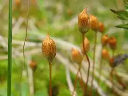 Polytrichum strictum is dioicous,[3] with male and female reproductive structures produced separately by male and female gametophytes, which are haploid (1n). As in other Polytrichum species, the antheridia are borne terminally on male plants and swell and burst when mature, launching sperm into the air; in addition, they develop in splash cups, which further facilitate sperm dispersal by catching and harnessing the energy of rain drops.[4] The lucky few sperm to land near the archegonia of a female plant (also borne terminally) use their two whiplash flagella to swim down the neck and into the venter, where one will fertilize the ovum. Once fertilisation takes place, the zygote develops into the diploid (2n) sporophyte, which consists of a foot (embedded in the tissue of the gametophyte), a seta (or stalk), and a capsule.[4] The capsule, which is covered by a dirty-white calyptra, matures after the seta elongates, at which point the calyptra is shed.[3][4] Within the capsule, each sporoctye undergoes meiosis to produce four haploid (1n) spores; when these are mature, the operculum is projected and the spores are released through the peristome, which is joined by the epiphragm and ringed by 64 nematodontous teeth.[3][4] When the proper conditions and substrate are available, the spores germinate into a filamentous protonema, from which the gametophytes emerge, completing the cycle.