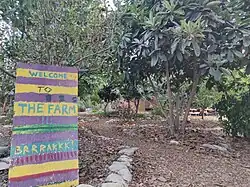 The farm occupies 1.2 acres (0.49 ha)[1] of the far southeastern corner of Pomona College's campus, within the naturalistic portion of the campus known as "the Wash" (formally Blanchard Park[11]). It is split into two halves, separated by the college's hammer throw field.[12] The West Farm includes the superadobe Earth Dome, as well as a number of fruit trees, rock-lined student plots, an outdoor classroom, and a chicken coop.[5] The East Farm has a 162-square-foot greenhouse and is used to grow crops and compost waste.[5][13] A number of coast live oak trees dot the area.[14]