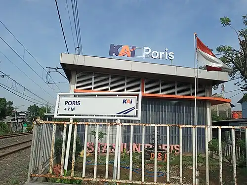 Poris Station (PI) is a class III railway station located in Poris Gaga, Batuceper, Tangerang. The station, which is located at an altitude of +7 meters, is included in the Jakarta Operational Area I, is the easternmost train station in Tangerang, and only serves the KRL Commuterline route.[3]