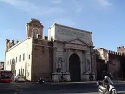Porta Pia was one of the northern gates in the Aurelian Walls of Rome, Italy. One of Pope Pius IV's civic improvements to the city, it is named after him. Situated at the end of a new street, the Via Pia, it was designed by Michelangelo to replace the Porta Nomentana situated several hundred meters southwards, which was closed up at the same time. Construction began in 1561 and ended in 1565, after the artist's death. A 1561 bronze commemorative medal by Gian Federico Bonzagna shows an early plan by Michelangelo, very different from his final design.[1] The façade on the outside of the city was completed in 1869 under the Neo-Classicist design by Virginio Vespignani.