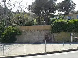 The surrounding wall and the bricked-up door of the Jewish cemetery on Via de Gasperi 1.
