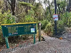 The central point is Kaikohe, from where the trail descends to the twin coasts, east and west. The Ōkaihau to Horeke section is grade 2-3. Most of the trail is off road grade 1-2 (easiest-easy), with some quiet country roads and a short section on State Highway 1, through the centre of Kawakawa. The western entrance at Baffin St, Opua is 4.4 km (2.7 mi) from the train section at Te Akeake, where a train runs to Taumarere, 3.2 km (2.0 mi) from Kawakawa. When the train isn't running there is a temporary 17.7 km (11.0 mi) alternative route (see below).[6][7] The trail runs beside the railway from Kawakawa to Taumarere.[8] Dogs, horses and motor vehicles are banned from some of the trail.[9][10] The trail is described as 4 sections -