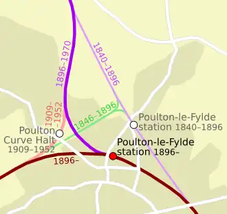 The original station was about 400 yards (400 m) north-east of the current location, at "The Breck".[1][2] The railway to the fishing town of Fleetwood, via Burn Naze, passed along a straight line east of the town. From 1846, there was a junction to Blackpool just north of the station, with tight connecting curves facing either way. In 1893 a fatal accident occurred when a train took the curve too fast.[3][4] Subsequently, in 1896, the tracks were realigned to follow a much gentler westward curve to Blackpool, with the new station halfway along the curve. The Fleetwood branch then curved to the east to rejoin the original alignment. The old station continued to be used as a goods station until 1968.[5]