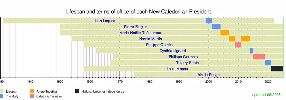This is a graphical lifespan timeline of presidents of the Government of New Caledonia. They are listed in order of office (Martin is shown in order of his first presidency).