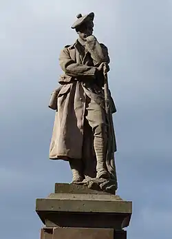 A war memorial, which commemorates the lives of local service personnel who died in the First World War, Second World War and the Spanish Civil War, stands near the town centre but is slightly obscured by the flanking buildings. It takes the form of a Scottish soldier in a Tam o' Shanter bonnet and greatcoat sculpted by William Birnie Rhind in 1921.[9]