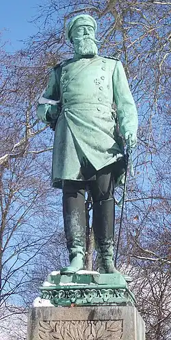 In the Franco-Prussian War of 1870–71, Wilhelm commanded the 1st Baden Brigade in the XIV Corps.[1][2] On 30 October 1870, Wilhelm and General Gustav Friedrich von Beyer assailed Dijon.[8] The French had transported 10,000 men by rail and the citizens of Dijon, including women, joined in the defense of the city against the Germans.[8] The resistance was not easily subdued and the Germans suffered heavy losses, however according to historian Gustave Louis Maurice Strauss, "[Wilhelm] carried the heights of St. Apollinari in gallant style and occupied the suburbs from which the Germans ultimately forced their way into the city where fierce fights from barricade to barricade from house to house lasted till midnight."[8] Dijon was occupied by 24,000 Prussians on 18 January 1870, but was reoccupied by the French after a severe battle, and subsequently retaken by the Prussians on 19 January, during which Wilhelm was shot in his cheek at Nuits-Saint-Georges.[1][2][9][10][11]
