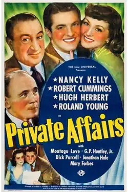 Private Affairs is a 1940 comedy film starring Nancy Kelly, with a supporting cast including Hugh Herbert, Roland Young, and Robert Cummings. The film was directed by Albert S. Rogell.[1]