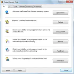 Private Disk is a disk encryption application for the Microsoft Windows operating system, developed by Dekart SRL. It works by creating a virtual drive, the contents of which is encrypted on-the-fly; other software can use the drive as if it were a usual one.