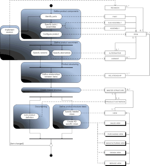 | Implement revision | If items (parts, subassemblies, assemblies) change they are implemented and the process of modeling the product structure is iterated, in order to ensure consistency. | |